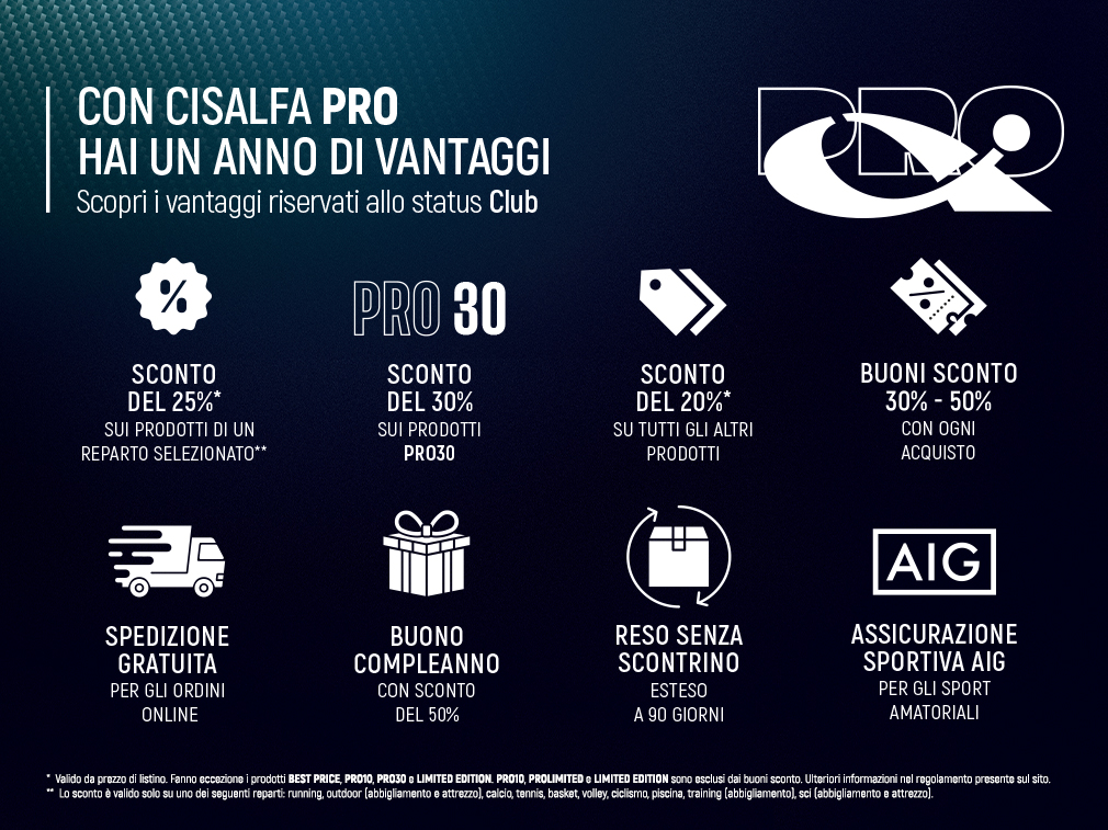 Grazie a questa convenzione potrai sottoscrivere l'abbonamento al programma CISALFA PRO a un prezzo a te riservato: 9€ anziché 15€/anno, ed otterrai sconto del 25% su prodotti del reparto Outdoor, sconto del 30% sui prodotti PRO30, -20% su tutti gli altri prodotti, buoni sconto 30%-50% con ogni acquisto, e molti altri vantaggi.
